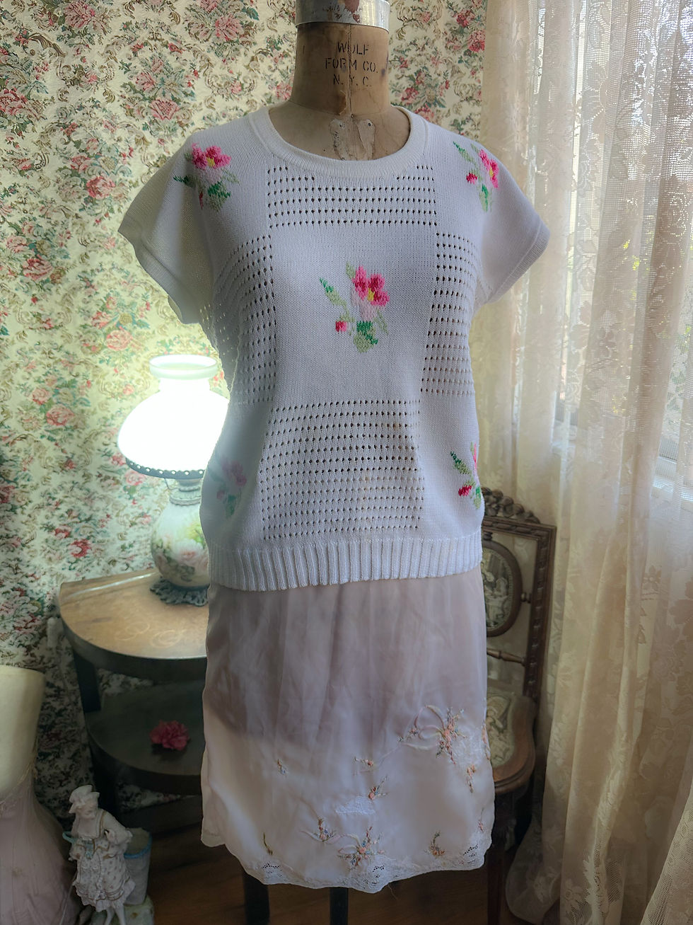 Blusa de tricô com belos bordados artesanais de flores em ponto cruz Veste do P